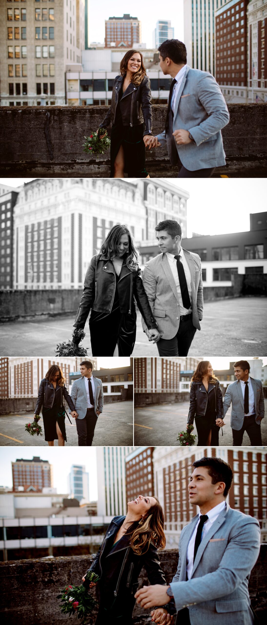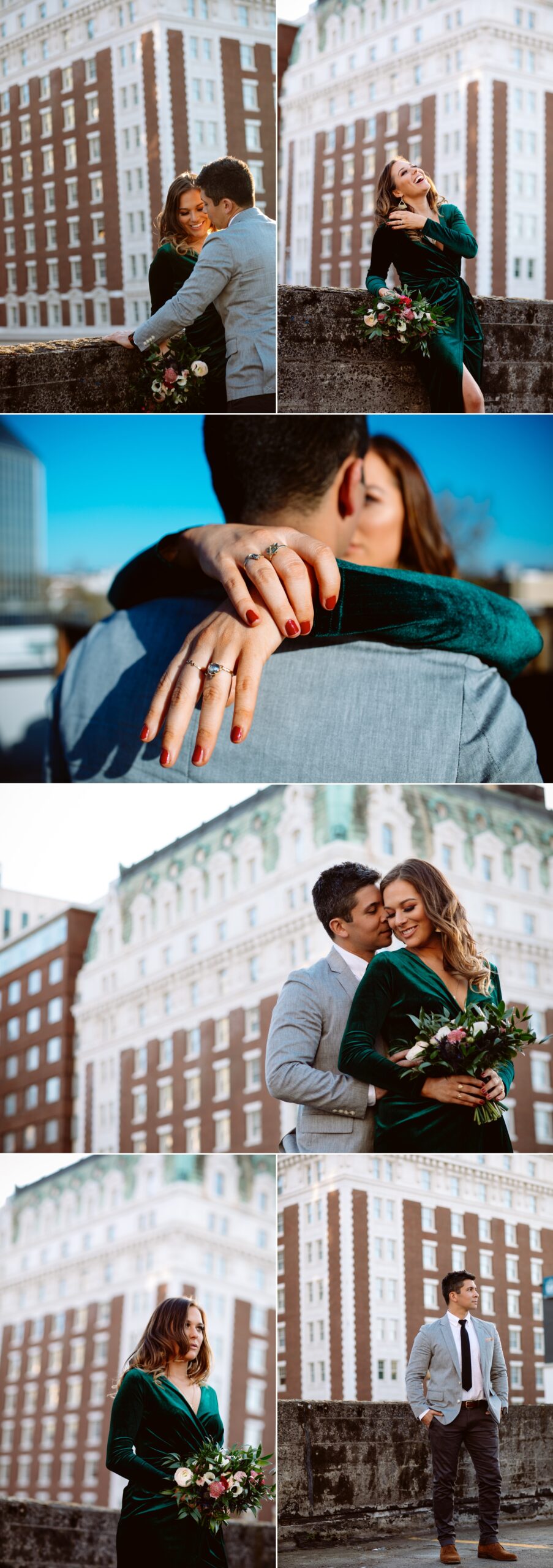So honored to have this edgy elopement inspiration photoshoot featured on the very hip wedding blog Whimsically wed! This bold and magnetic elopement was inspired by the classic architecture of downtown Portland mixed with the grit of the city. Because Portland is becoming such a fun wedding destination, I wanted to highlight the unique urban architecture of historic downtown Portland. It became an incredibly unique photo session between all the fun backdrops such as the psychic readings sign and rooftop dance session. (dip baby dip!) We highlighted the evening sunlight and the cities’ outstanding architecture against the sky along with Molly’s unique emerald velvet dress and sexy leather coat and Matthew’s tweed Jcrew jacket and smooth moves. Thank you Brenna Burnett for floral styling and Biancar for hair and makeup. Inquire for elopement packages.